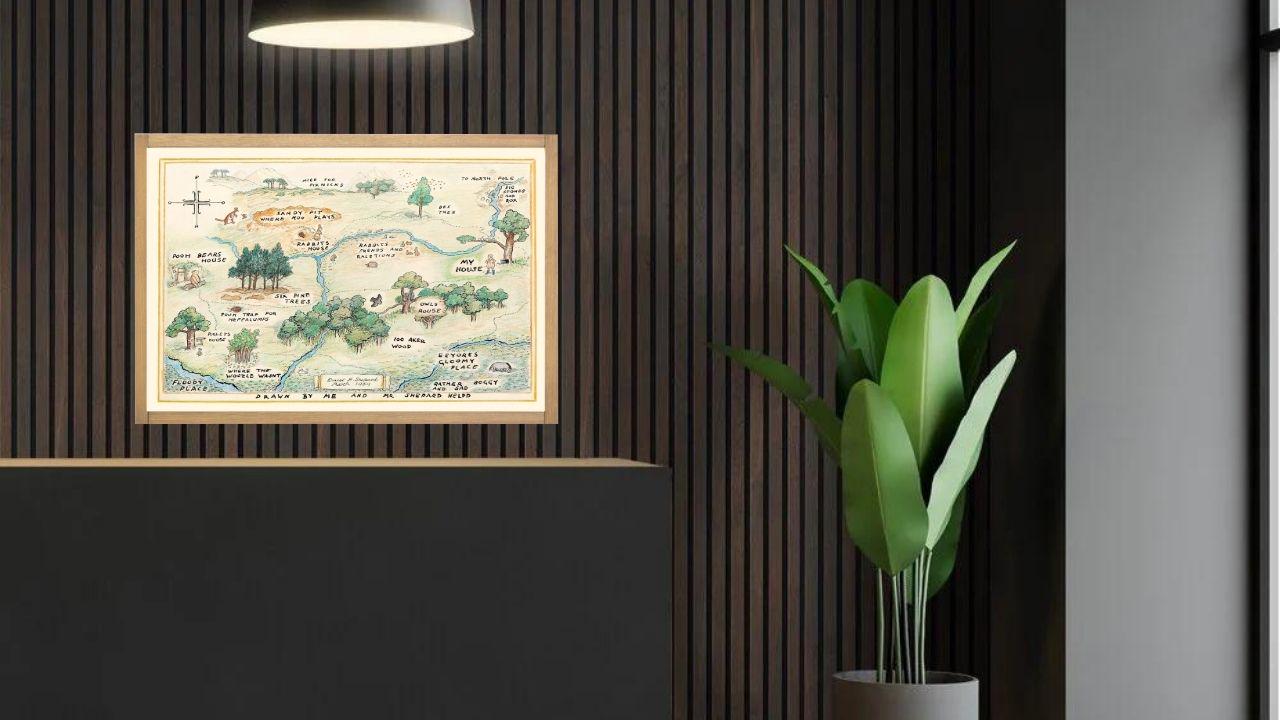Bring the magic of childhood into your little one’s room with this beautifully illustrated 100 Acre Wood Map wall art. Inspired by the classic tales of Winnie the Pooh, this nursery print showcases the whimsical forest where Pooh, Piglet, Tigger, and Eeyore go on their adventures.
