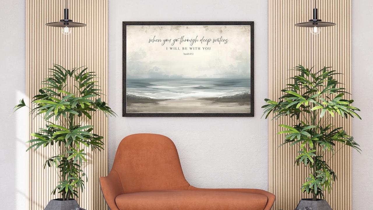 Christian Wall Art | Isaiah 43:2 Bible Verse Sign | Scripture Ocean Print | Faith Home Décor | Framed Wood Sign