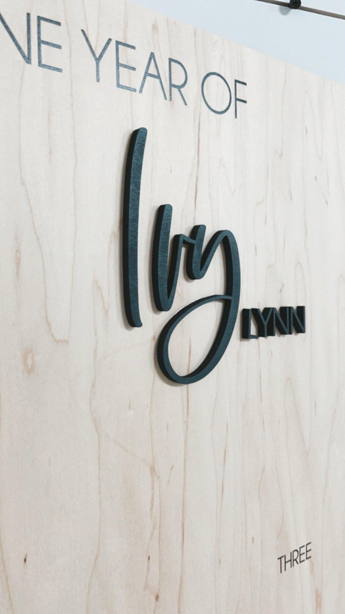 The sign will have “one year of with your babies name. The name will be 3D and the rest of the board will be printed in black. This will be displayed on 1/4" piece of furniture grade wood. This does include the birth photo. There will be a blank space for 3x3, 4x4 or 5x5 photos to be attached by you so the photos will not come with it.