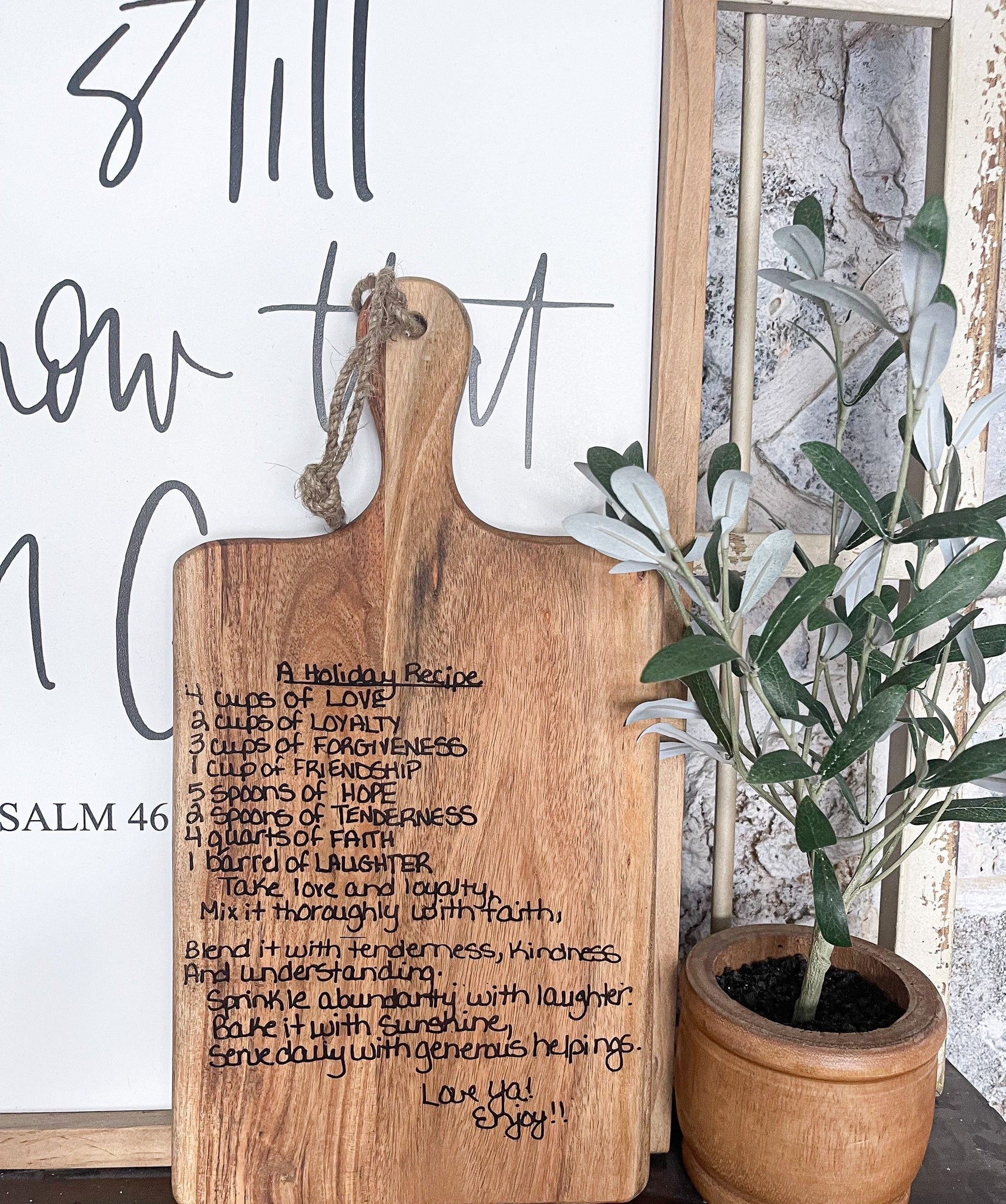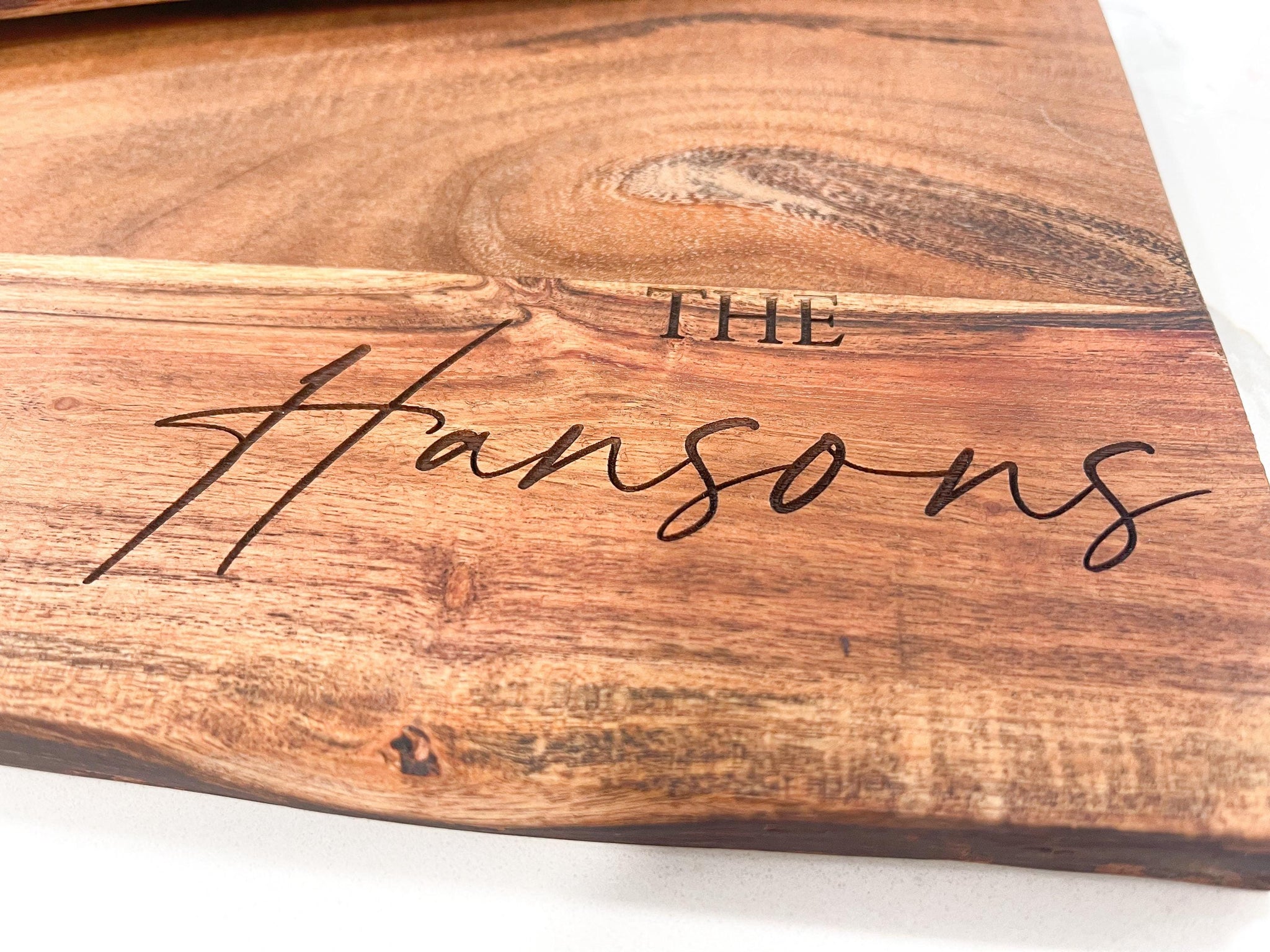 Bring a personal touch to your kitchen or gifting with this custom engraved cutting board. Featuring your family name or custom text, it’s a versatile piece for everyday use, charcuterie, or as a display keepsake.